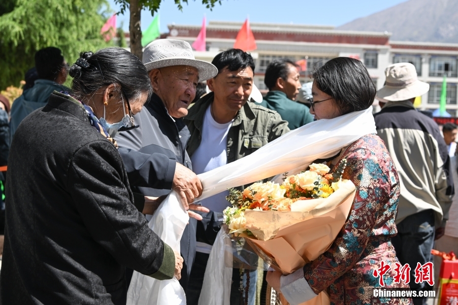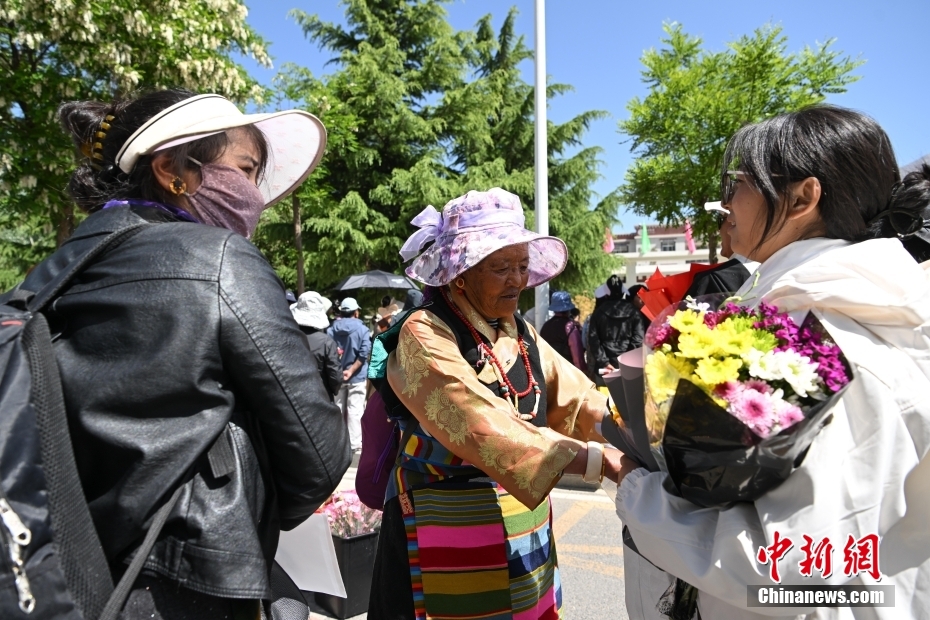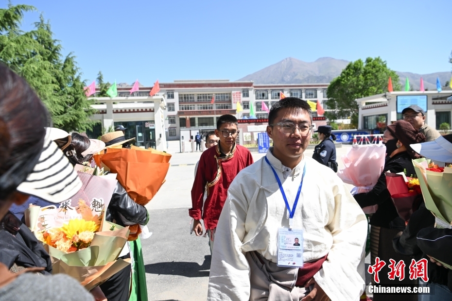 6月9日上午11時30分,西藏自治區2025年普通高考完成所有科目考試。圖為家長在拉薩市拉薩中學考點外為結束考試的孩子獻鮮花。中新社記者 李林 攝