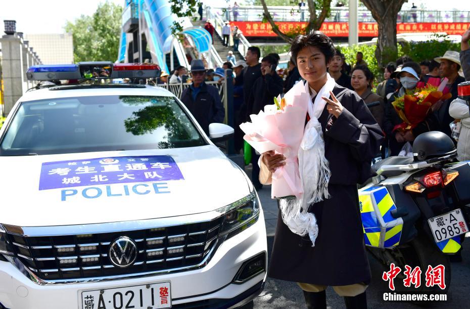 6月9日上午11時30分,西藏自治區2025年普通高考完成所有科目考試。圖為考生手捧鮮花在車牌尾號為“211”和“985”的車輛旁留影。中新社記者 李林 攝