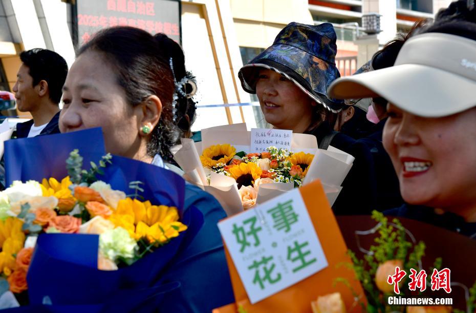 6月9日,西藏拉薩江蘇實驗中學考點外親友為考生送鮮花。當日,西藏自治區2025年普通高考完成所有科目考試,2025年西藏高考落下帷幕。中新社記者 貢嘎來松 攝