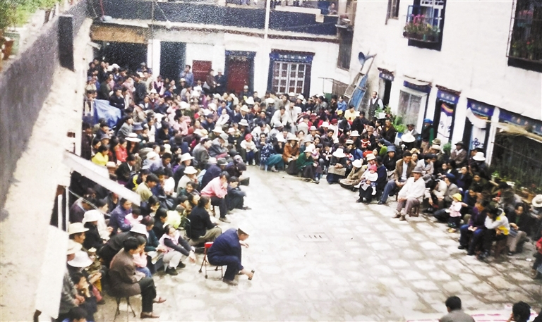 在當時拍的另一張照片上,幾十位居民擠在過道里準備投票。“那時候院子小,選舉時得側著身子站。”德吉卓嘎回憶道,“院子窄小,雨天積水,但絲毫不影響大家參與社區(qū)事務的熱情。”照片的一角,13歲的普布普赤正躲在母親身后好奇張望,如今她41歲,已成長為大院的戶長。