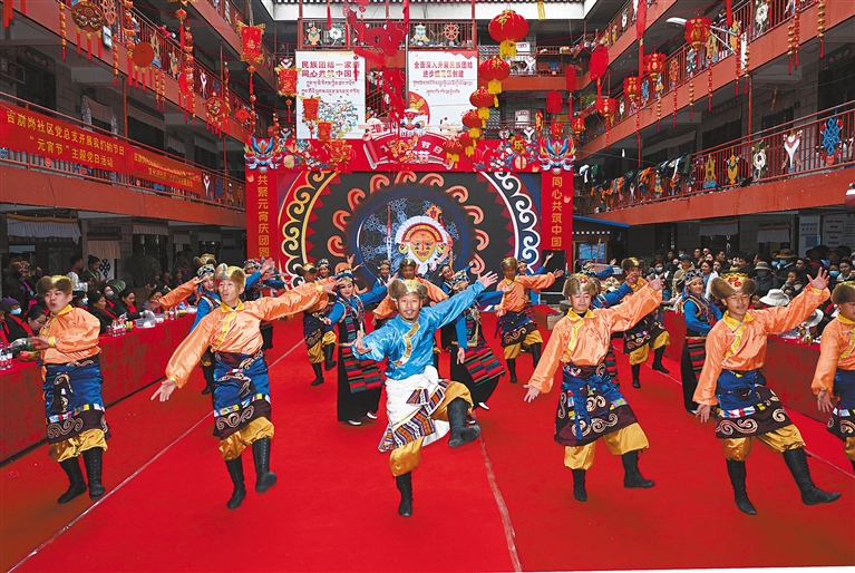 2025年2月23日,吉崩崗街道德賽大院開展慶元宵活動,雪巴拉姆藝術團舞蹈演員正在表演節(jié)目。(資料圖片)