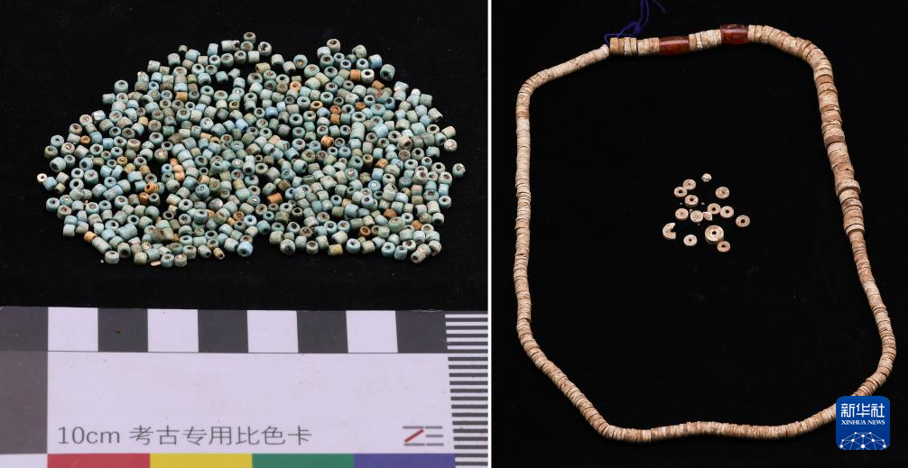 這是瑪不錯(cuò)遺址出土的費(fèi)昂斯珠(左)和帶有紅玉髓的滑石珠串(拼版照片)。新華社發(fā)(西藏自治區(qū)文物保護(hù)研究所供圖)