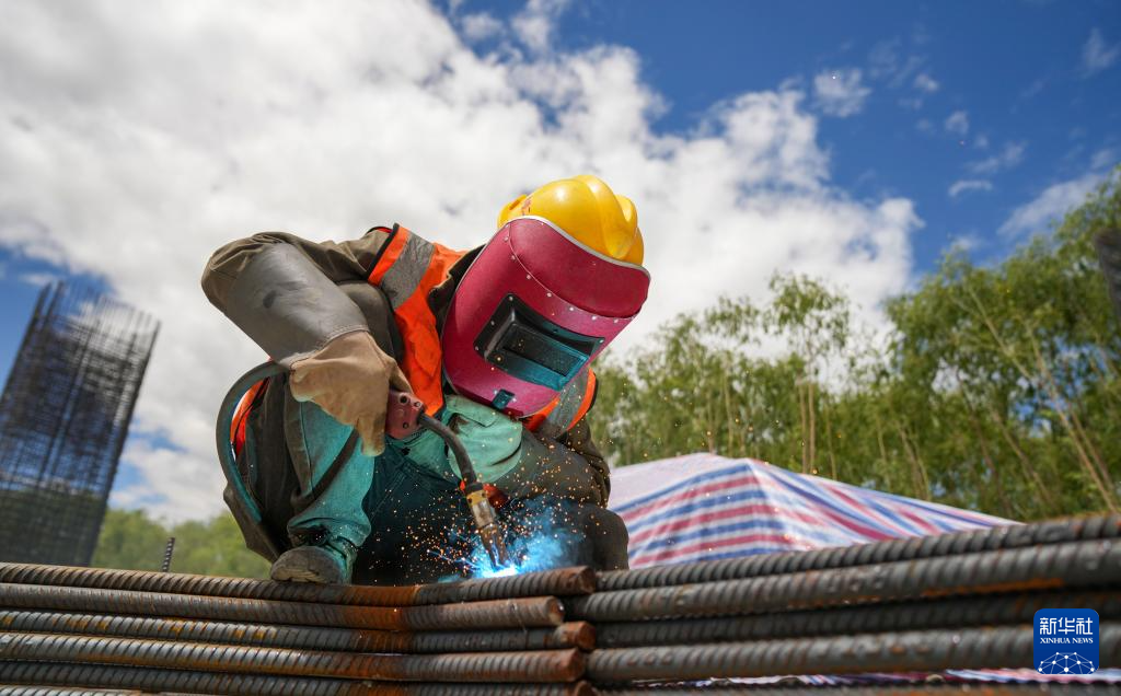 工人在薩熱路跨江大橋建設現場焊接鋼筋(6月18日攝)。新華社記者 晉美多吉 攝