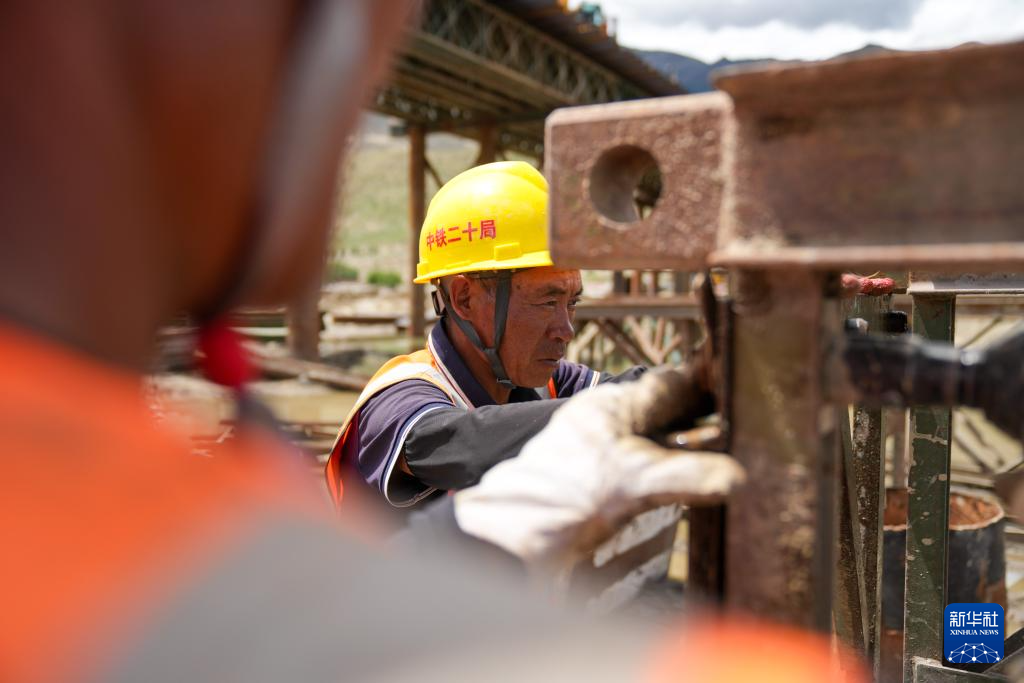 工人在薩熱路跨江大橋建設現場拼裝支撐架(6月18日攝)。新華社記者 晉美多吉 攝