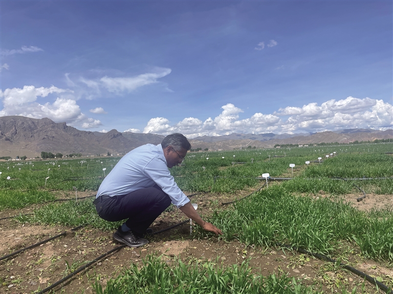 西藏自治區農牧科學院農業研究所副研究員達瓦頓珠在田里查看青稞長勢。