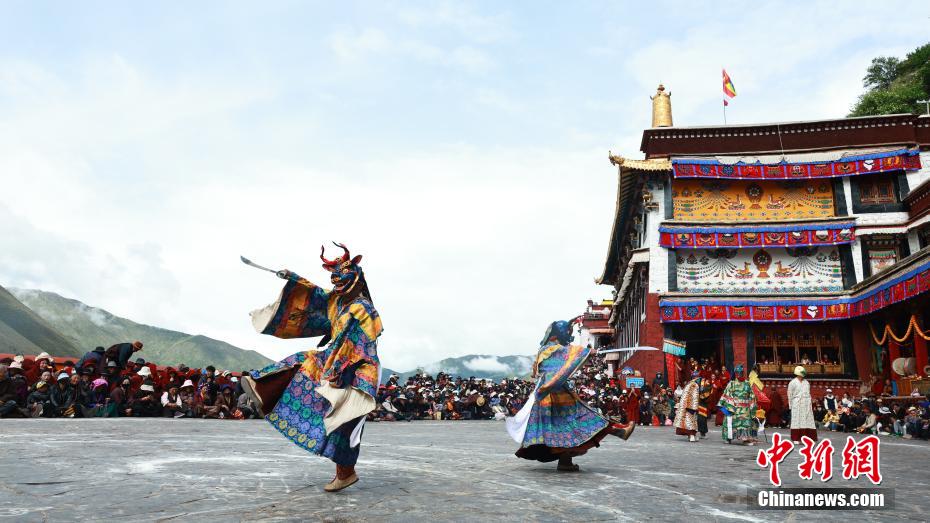 近日,西藏自治區拉薩市墨竹工卡縣直孔替寺舉行中國國家級非物質文化遺產直孔嘎爾羌姆(跳神)活動。直孔嘎爾羌姆是藏傳佛教重要的宗教舞蹈藝術形式,“嘎爾”意為“樂舞”。其表演具有規范化的舞蹈動作、獨特的伴奏音樂和完整的儀軌流程。圖為西藏拉薩市墨竹工卡縣直孔替寺僧人們佩戴面具參加跳神活動。