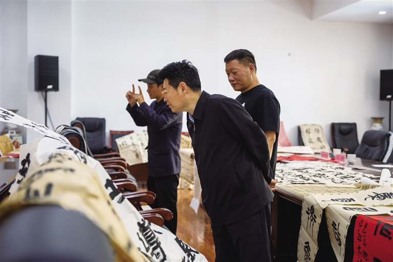 在8日上午的評選現場,氣氛嚴肅而熱烈,藏文書法作品評選率先拉開帷幕。兩百余幅作品鋪滿了評選場地,評委們時而俯身細看,時而交流討論,手中的評分表承載著他們對每一幅作品的嚴謹評判。這些作品涵蓋了區級字體瓊赤體,以及果洛德昂灑智、尼赤等國家級非物質文化遺產字體,風格各異,卻都蘊含著對藏文書法藝術的執著與熱愛。中國書協理事、西藏書協副主席、國家二級美術師江村表示:“今天參賽作品數量多、字體齊全,尤其值得一提的是,此次作品中出現了多種國家級字體,這是以往較為少見的,整體質量較以往有明顯提升。”最終脫穎而出的一等獎草書作品,以其有力的字法、筆法、章法,緊扣主題的內容,傳遞出共同進步和發展的精神,極具感染力,贏得了評委們的一致認可。