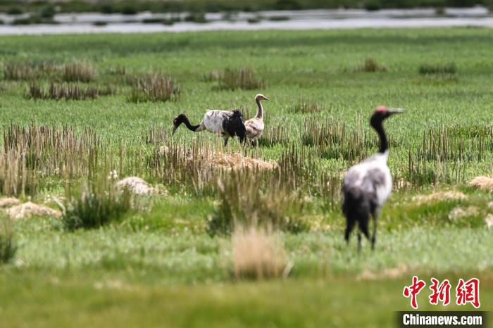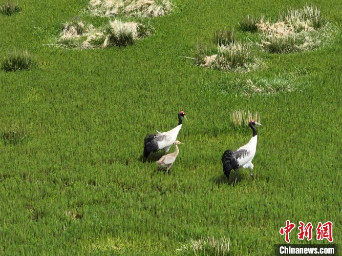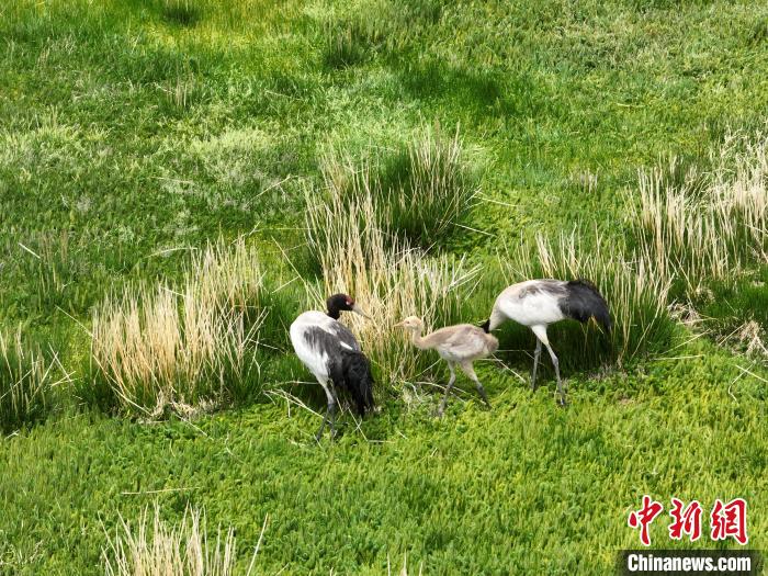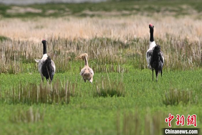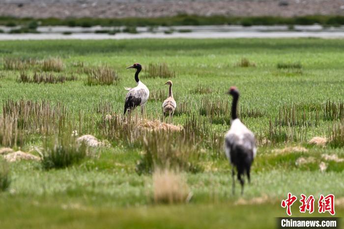 7月10日,在海拔4700米的西藏自治區那曲市申扎縣濕地里,黑頸鶴一家在悠閑覓食。黑頸鶴是中國國家一級重點保護野生動物,屬高原特有鶴類,主要棲息于海拔2500米至5000米的高原沼澤地、湖泊及河灘等濕地環境。每年四月起,成對的黑頸鶴陸續飛抵西藏自治區那曲市申扎縣,在此繁育后代。近年來,申扎縣持續加強生態修復,濕地面積擴大、水質改善,為黑頸鶴等珍稀物種提供了理想家園。中新社發 毛建軍 攝
