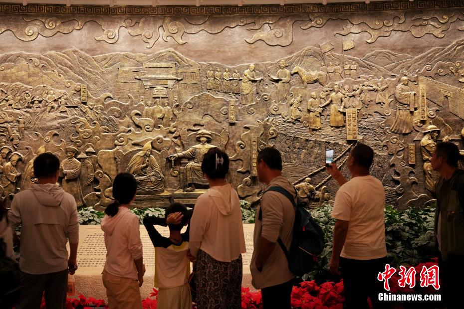 7月15日,在位于西藏拉薩的西藏博物館,觀眾參觀西藏歷史畫卷浮雕。據了解,西藏博物館設有基本陳列《雪域長歌—西藏歷史文化展》《離太陽最近的人—西藏民俗文化展》,充分展示西藏地區歷史發展進程與文化面貌。中新社記者 張祥毅 攝