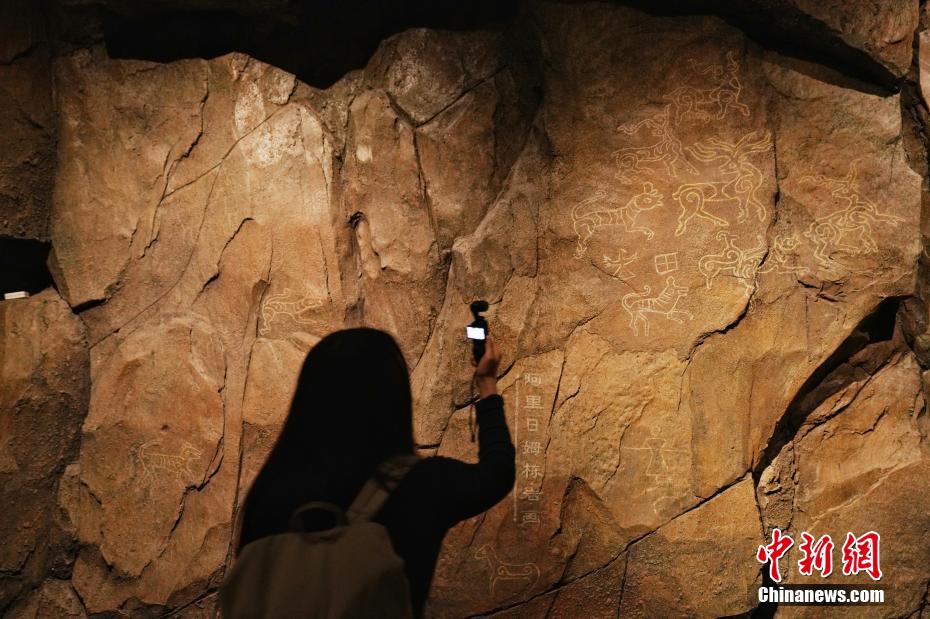 7月15日,在位于西藏拉薩的西藏博物館,觀眾拍攝復原的阿里日姆棟巖畫。據了解,西藏博物館設有基本陳列《雪域長歌—西藏歷史文化展》《離太陽最近的人—西藏民俗文化展》,充分展示西藏地區歷史發展進程與文化面貌。中新社記者 張祥毅 攝