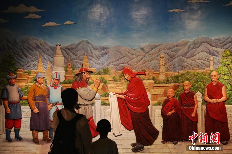 7月15日,在位于西藏拉薩的西藏博物館,觀眾參觀“涼州會談”場景,“涼州會談”結束了吐蕃地方政權對西藏的長期分治局面,順應了國家統一的歷史潮流。據了解,西藏博物館設有基本陳列《雪域長歌—西藏歷史文化展》《離太陽最近的人—西藏民俗文化展》,充分展示西藏地區歷史發展進程與文化面貌。中新社記者 張祥毅 攝