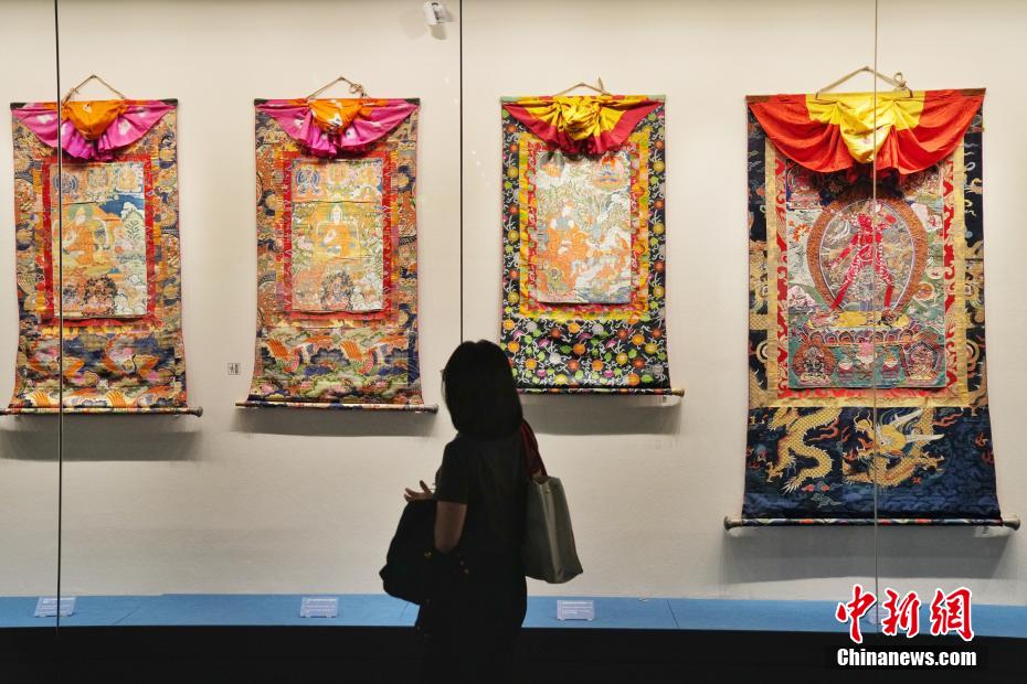 7月15日,在位于西藏拉薩的西藏博物館,觀眾品鑒唐卡藝術。據了解,西藏博物館設有基本陳列《雪域長歌—西藏歷史文化展》《離太陽最近的人—西藏民俗文化展》,充分展示西藏地區歷史發展進程與文化面貌。中新社記者 張祥毅 攝