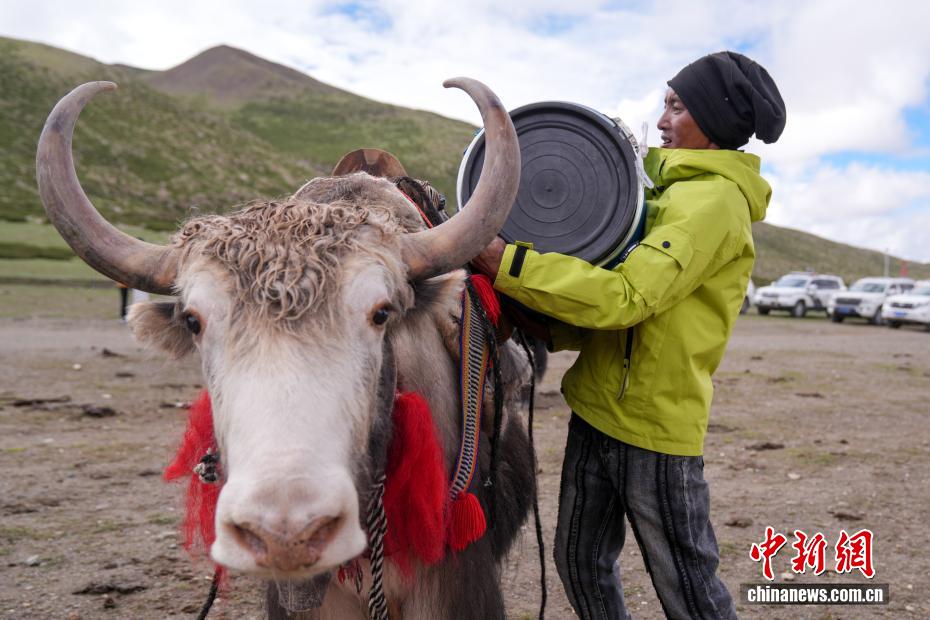 7月21日,在岡仁波齊山腳下,牦牛運輸隊隊員往牦牛背上綁縛物資,準備將其運輸至轉山徒步路線的補給站。岡仁波齊位于西藏阿里地區普蘭縣境內,是岡底斯山的主峰,也是藏傳佛教的神山之一,每年吸引眾多信徒前往轉山,并衍生出徒步旅行的經典路線。每年來自國內外的徒步旅行者為當地創造就業機會的同時,也推動了文旅產業的發展。中新社記者 張祥毅 攝
