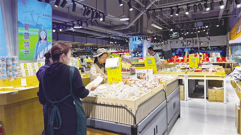 除了家電賣場,特產超市也迎來了消費熱潮。在位于拉薩市濱河路乃倉廣場負一樓的藏匯倉·西藏特產倉儲超市(乃倉總店),前來選購特產的消費者絡繹不絕,貨架前時常排起長隊。該超市負責人李紅容笑著說:“今年上半年的客流量和銷售額都比去年同期上漲了不少,像牦牛肉干、藏香、青稞制品這些特色產品特別受歡迎。一方面是本地市民買回去自己吃或者送給外地朋友;另一方面很多游客也會專門過來采購,把西藏的味道帶回去。現在物流方便,我們還開通了快遞直發服務,不少消費者在線上下單,店里的線上訂單量每個月都在增加。為了滿足消費者需求,我們還增加了產品種類,光是青稞制品就有青稞餅干、青稞麥片、青稞酒等二十多個品種?!?/p>