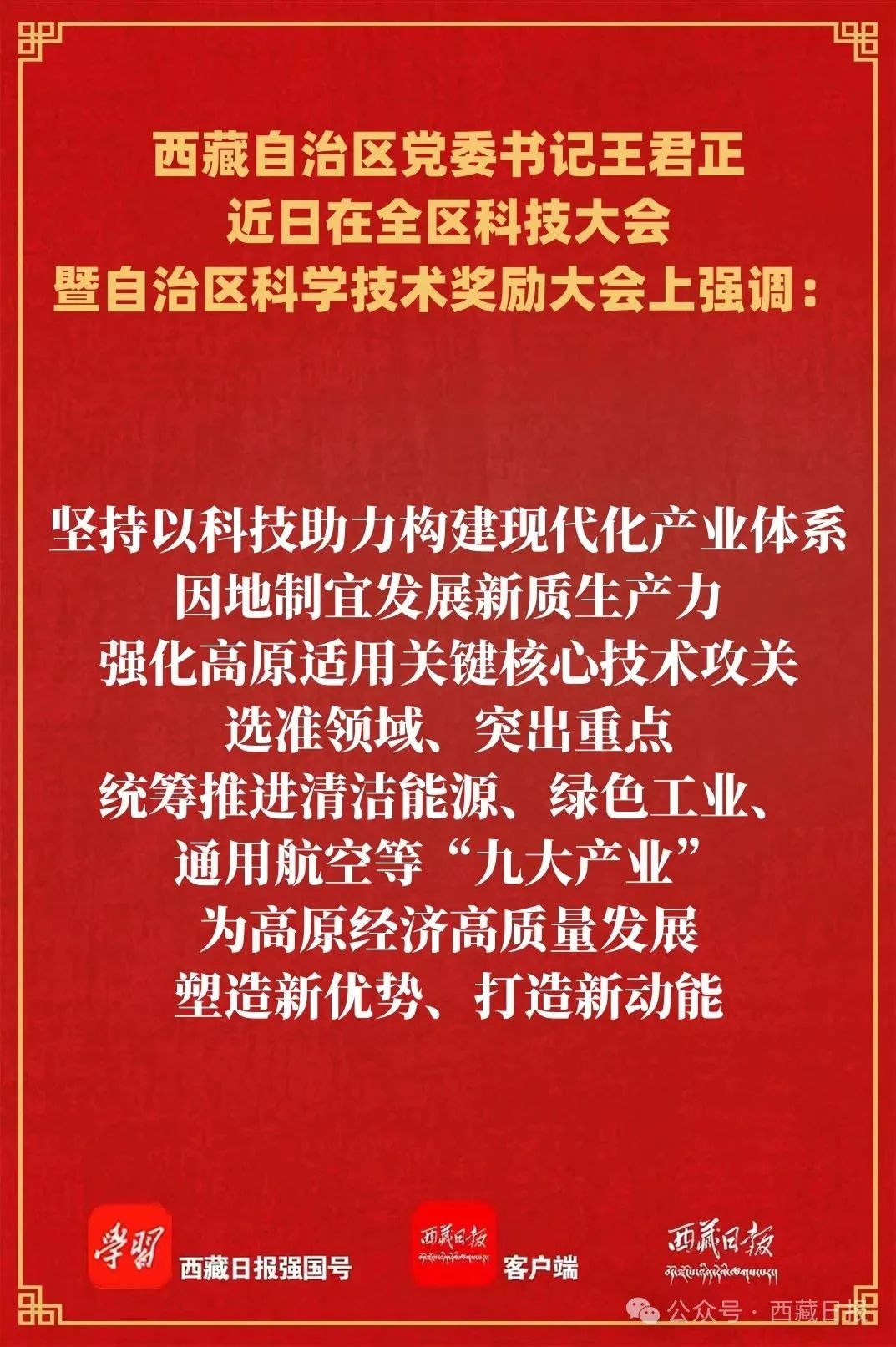 王君正強調,要聚焦工作重點,聚力科技攻關,讓科技創新成果更好服務社會主義現代化新西藏建設。堅持以科技助力提升社會治理體系和治理能力現代化水平,向科技要警力、向信息化要戰斗力,加大數字基礎設施建設,拓寬新技術、新手段應用場景,維護社會大局和諧穩定,為長治久安打下堅實基礎。堅持以科技助力構建現代化產業體系,因地制宜發展新質生產力,強化高原適用關鍵核心技術攻關,選準領域、突出重點,統籌推進清潔能源、綠色工業、通用航空等“九大產業”,為高原經濟高質量發展塑造新優勢、打造新動能。堅持以科技助力生態文明高地建設,樹牢“兩山”理念,加快第二次青藏高原綜合科考成果轉化,科學推進南北山綠化工程,加強水、大氣和土壤污染防治、環境監測與環境應急技術研發應用,保護好青藏高原的生靈草木、萬水千山。堅持以科技助力民生改善,深化“互聯網+政務服務”,完善一體化政務服務平臺,加強重大疾病防治、高原醫學、藏醫藥等方面的研究,推進遠程教育建設,不斷增強各族群眾的獲得感幸福感安全感。堅持以科技助力強邊固防,把科技創新融入強邊固邊興邊各環節,加大智慧邊防建設力度,加快補齊數字基礎設施短板,確保邊防鞏固邊境安全。