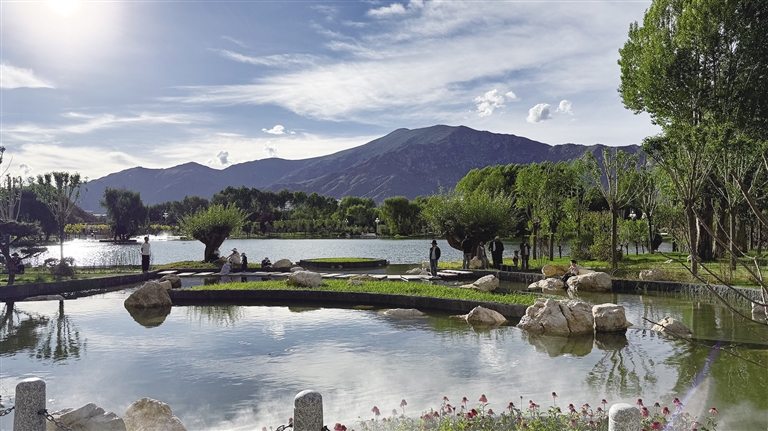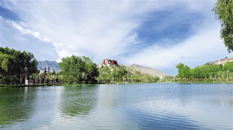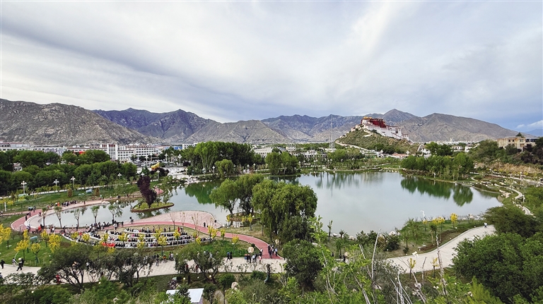 拉薩團(tuán)結(jié)公園坐落于布達(dá)拉宮西麓、藥王山腳下。昔日,這里房屋高低錯(cuò)雜、線纜交錯(cuò)密布、市場(chǎng)喧鬧擁擠、環(huán)境喧囂擾攘,不僅影響城市形象和生態(tài)環(huán)境,還影響出行游玩體驗(yàn)。如今,湖水如碧綢般清澈,岸邊綠樹(shù)成蔭,各類(lèi)花卉競(jìng)相綻放,昔日雜亂之地已蛻變?yōu)轸浯涿髦椋宋墓袍E與自然景致相映成趣,共同繪就出“百澤繞城·水城相依”的生態(tài)文明畫(huà)卷。