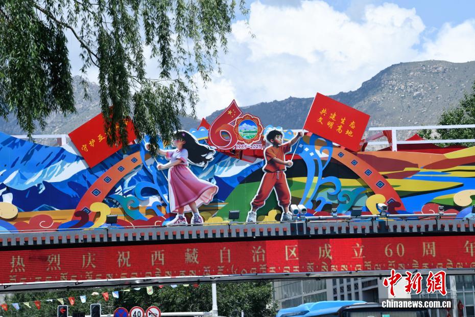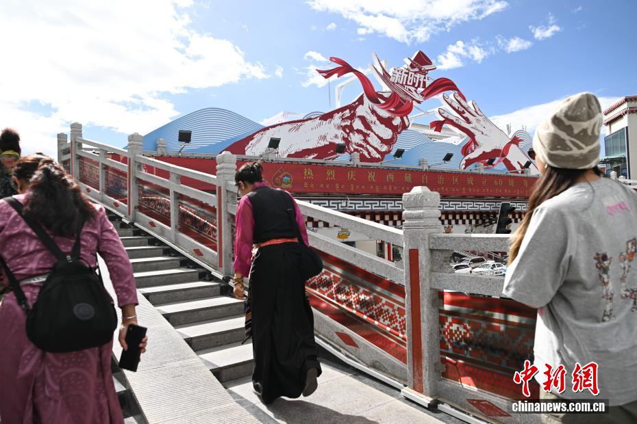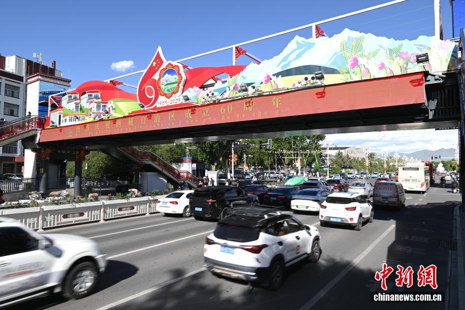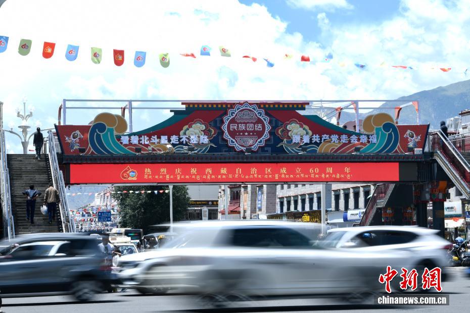 拉薩正以最美姿態,迎接這一重要時刻。圖為裝扮一新的人行天橋。中新社記者 貢嘎來松 攝