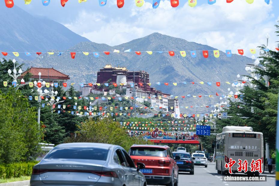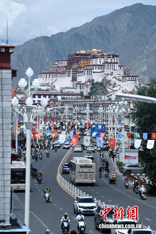 圖為市區主干道上懸掛的彩旗。中新社記者 貢嘎來松 攝