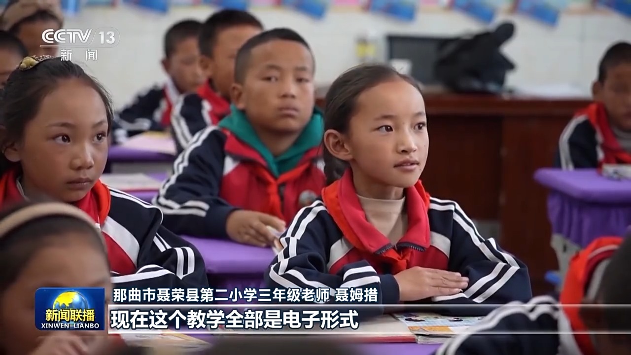 那曲市聶榮縣第二小學三年級老師 聶姆措:變化特別大,以前鄉鎮里面都是帳篷學校,黑板就是這么小的一個木板,冬天帳篷里面的話,手腳都是凍著的。現在這個教學全部是電子形式,條件特別好。
