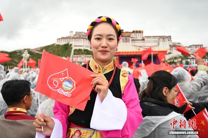 8月21日,拉薩古城居民羅桑群佩在布達拉宮廣場參加慶祝活動。中新社記者 趙朗 攝