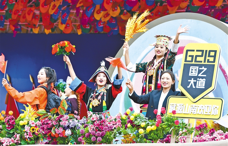 “藏源山南”彩車上的演員通過布達拉宮廣場時向人群揮手。
