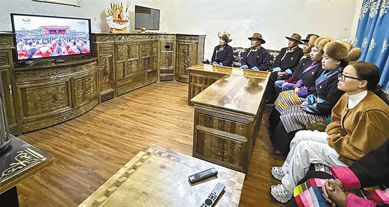 日喀則市謝通門縣仁欽則鄉(xiāng)倫珠孜村的村民們集中觀看了現(xiàn)場直播,現(xiàn)場不時傳出熱烈掌聲。老黨員仁增多吉感慨萬千:“我深切體會到了沒有中國共產(chǎn)黨就沒有社會主義新西藏,就沒有我們今天的幸福生活。我將始終維護祖國統(tǒng)一,加強民族團結(jié),堅定不移聽黨話、矢志不渝跟黨走。”