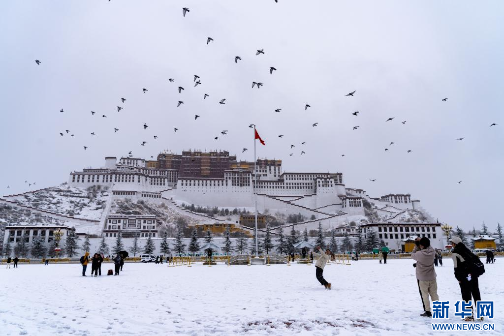 當日是農歷臘月初八,西藏拉薩市迎來降雪,城區銀裝素裹,雪景分外優美,吸引了眾多市民外出拍攝游玩。