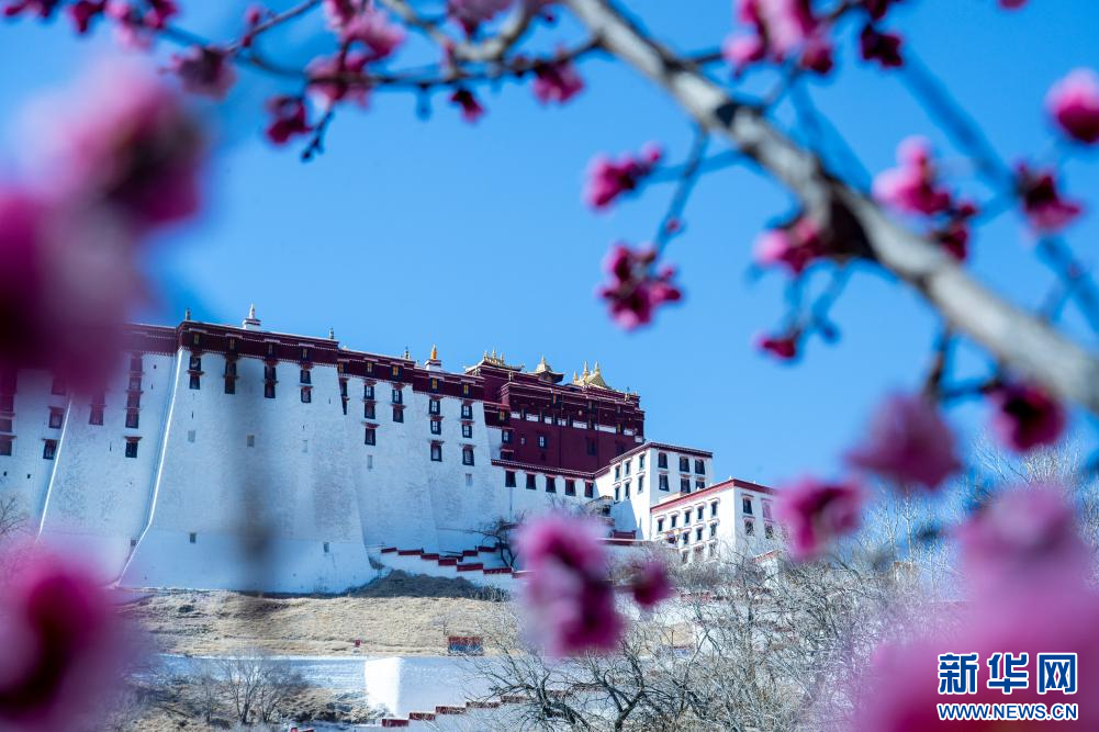 在位于拉薩北部的古剎帕邦喀附近拍攝的盛開的桃花,遠處是布達拉宮(4月9日攝)。新華社記者 丁增尼達 攝