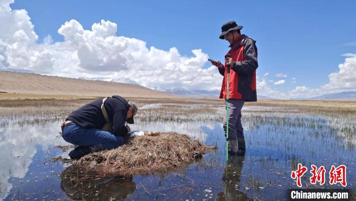 圖為楊巨才(右)在甘肅酒泉市肅北縣黨河濕地開展黑頸鶴巢位監測工作。(資料圖) 受訪者供圖